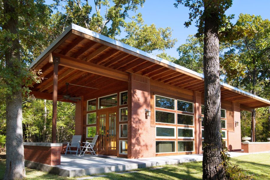 He quickly decided the land would be perfect for a warren of wooded cabins. For the first one, he took inspiration from Frank Lloyd Wright’s Darwin Martin House in Buffalo, New York. He even tracked down the brick manufacturer in Kansas City, Kansas, which still had the original molds and re-created the bricks for him. Thanks in part to its proximity to several wedding venues, the cabin immediately rented out. Risinger has since added three unique designs and has plans for more, including a treehouse.